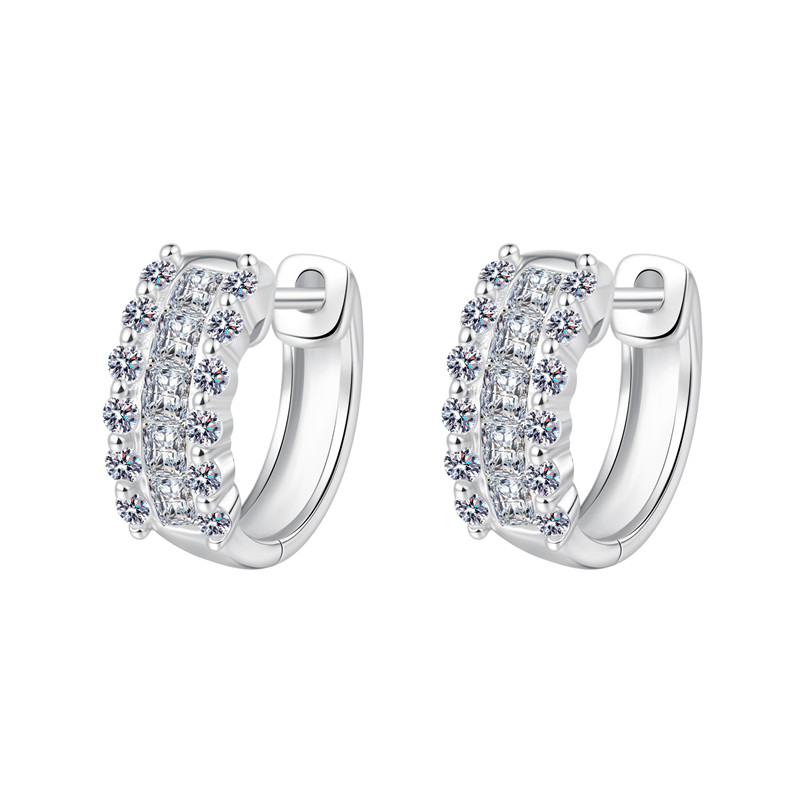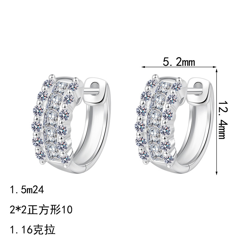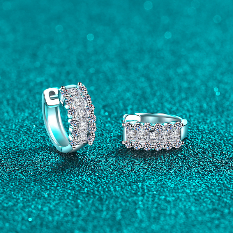 【莫桑鑽】1.2克拉小方鑽圓鑽鑲邊耳圈S925銀鍍鉑金耳環