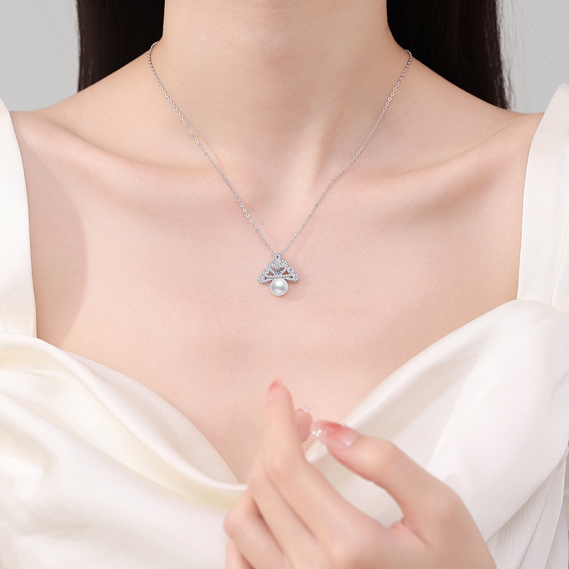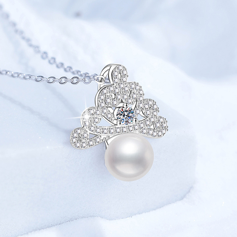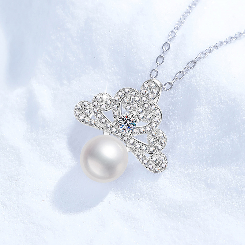 【莫桑鑽】冰雪皇冠10分圓鑽8mm淡水珍珠S925銀鍍鉑金項鏈40+5CM