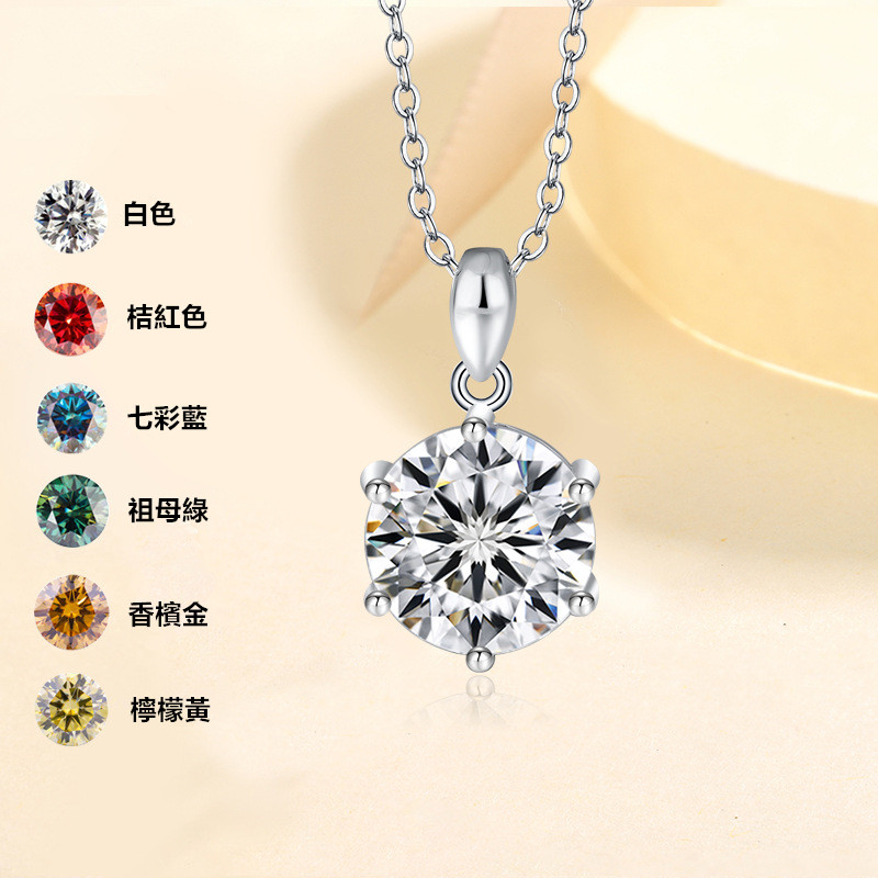 【莫桑鑽】六種顏色1-5克拉六爪圓鑽S925銀鍍白金項鏈