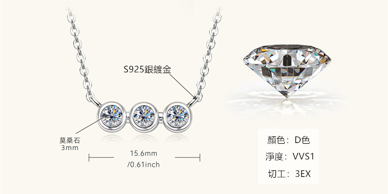 【莫桑鑽】10分小泡泡*3顆S925銀鍍金項鏈