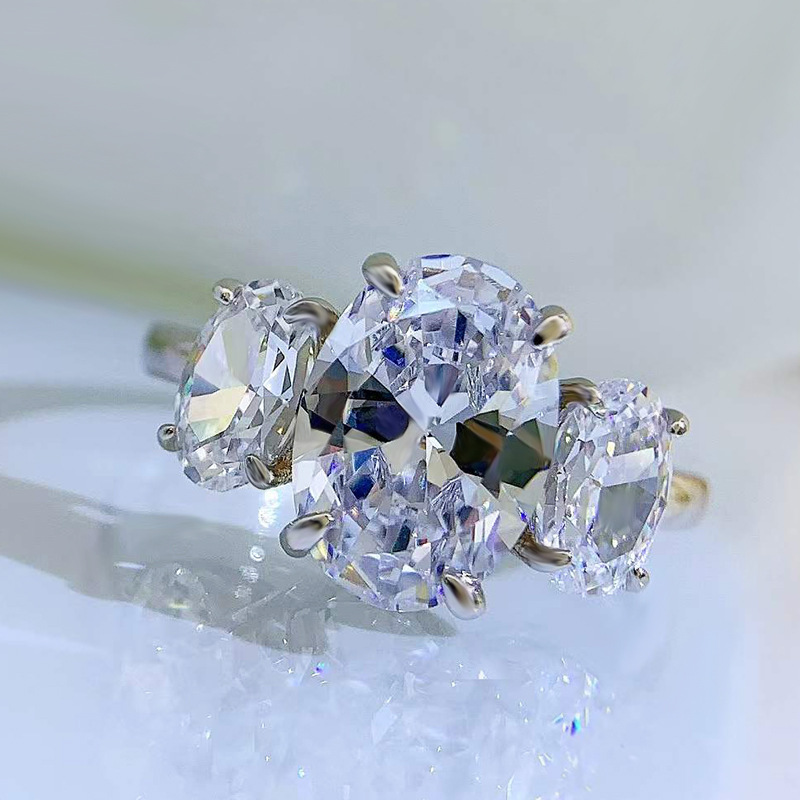 【S925銀鍍白金】奢華歐美風8*11橢圓高碳鑽三石戒指