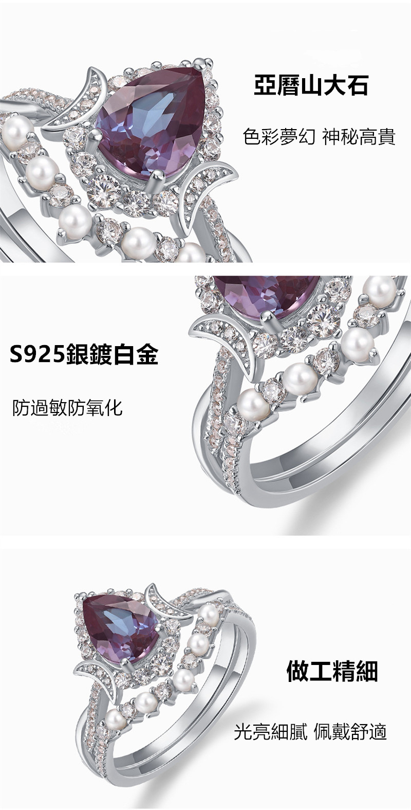 【S925銀鍍白金】水滴型亞曆山大石淡水珠二合一疊戴戒指