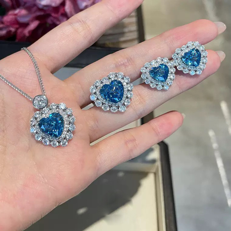 【S925銀鍍白金】培育海藍寶9*11mm冰花切愛心高碳鑽項鏈/耳環/戒指 數量