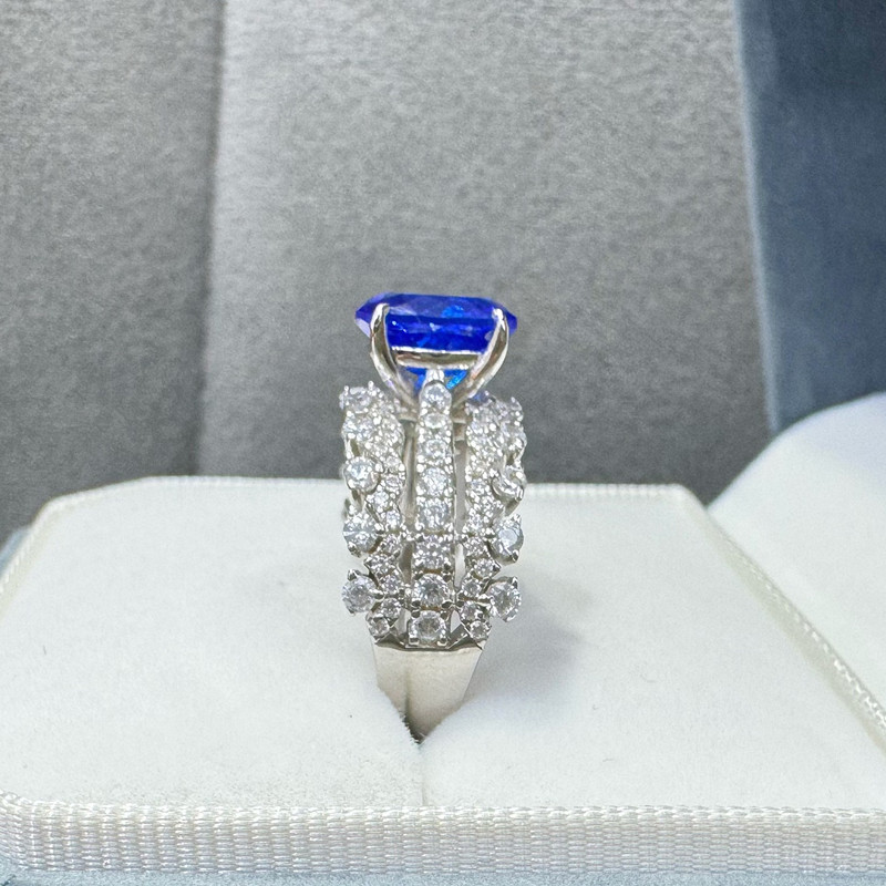 【S925銀鍍白金】2克拉蛋形7*9mm培育藍寶石三層戒指