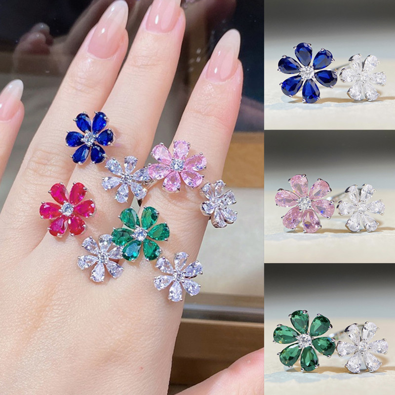 【S925銀鍍白金】四色可選培育鑽雙花開口戒指