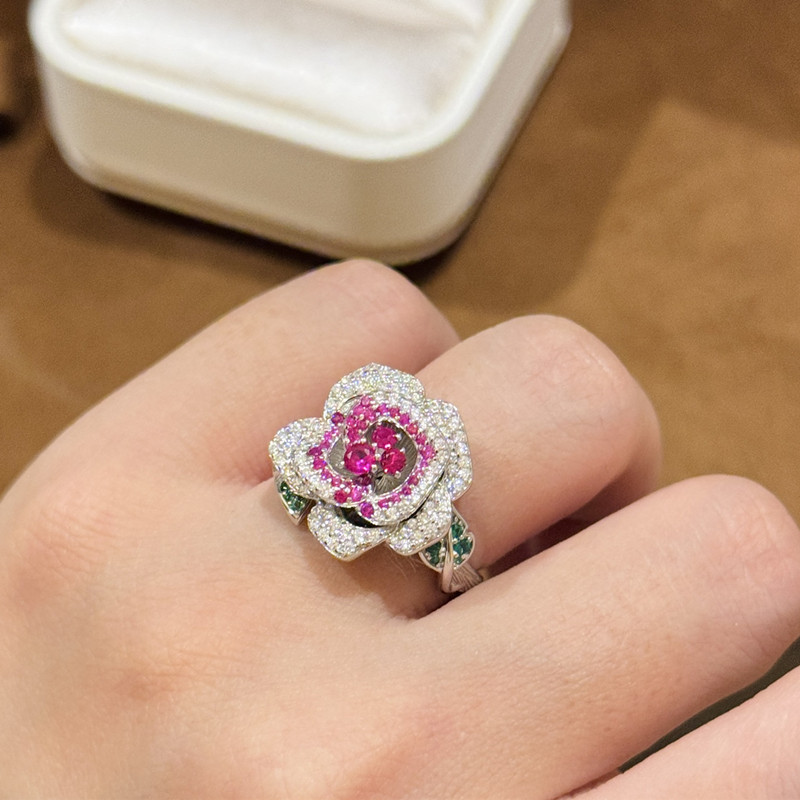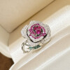 【S925銀】立體粉鑽玫瑰花綠葉戒指
